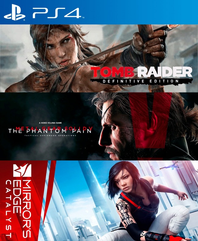El pack incluye: - Tomb Raider Definitive Edition PS4 - METAL GEAR SOLID V THE PHANTOM PAIN PS4 - Mirrors Edge Catalyst PS4 Pesos de los juegos : 61 GB Requerido en consola : 80 GB Instalación : 1 consola